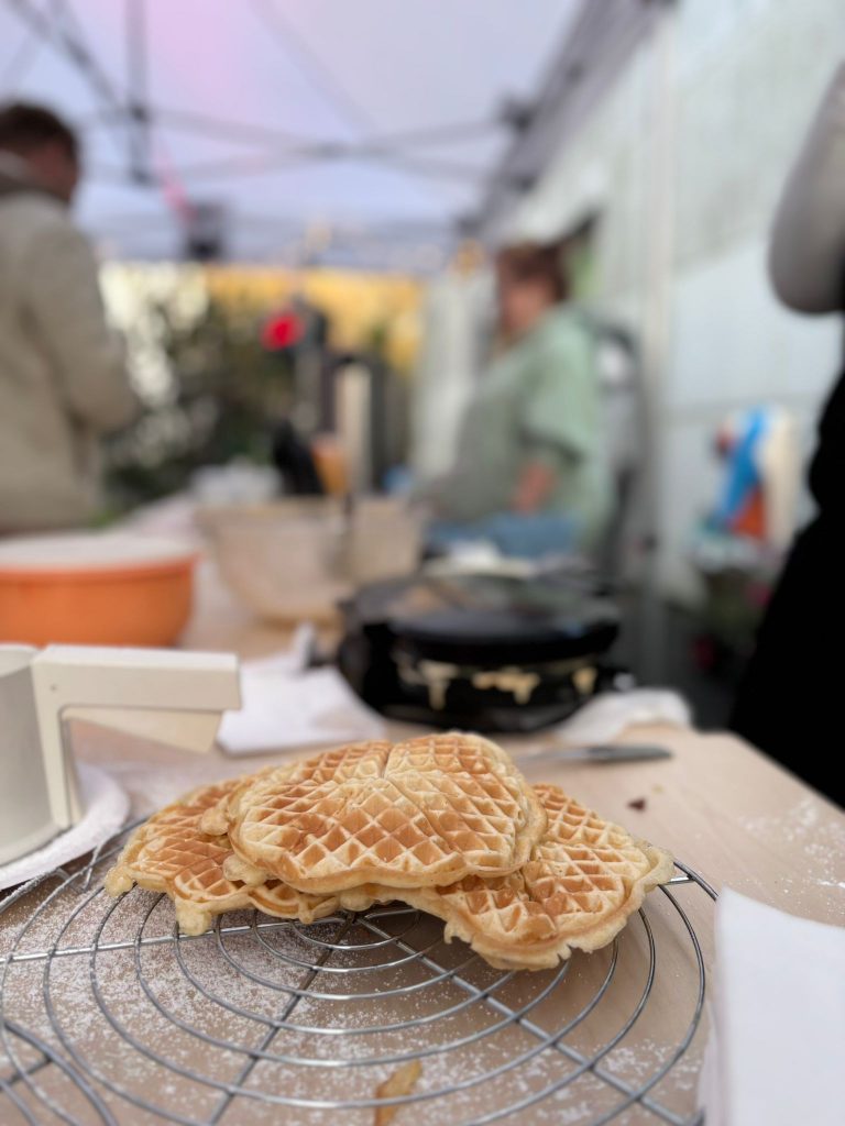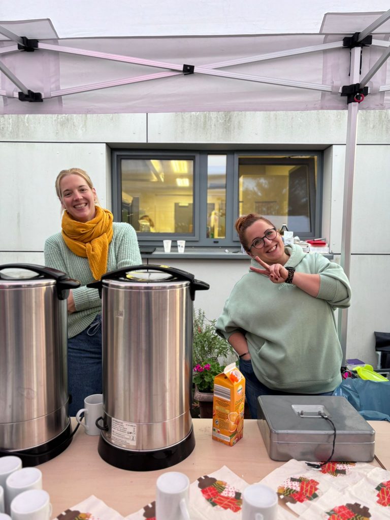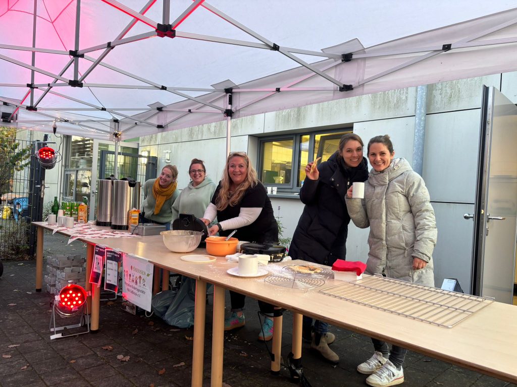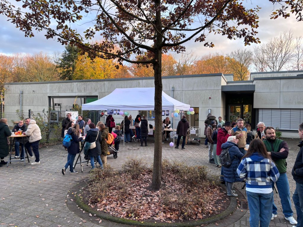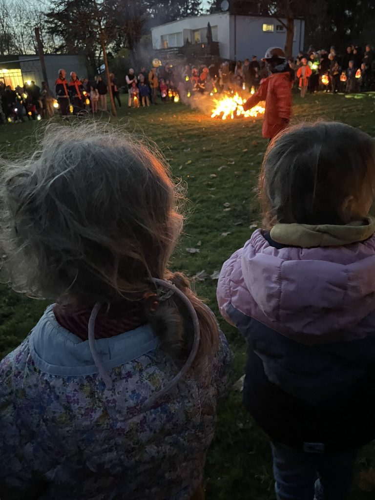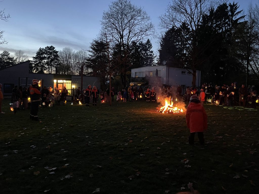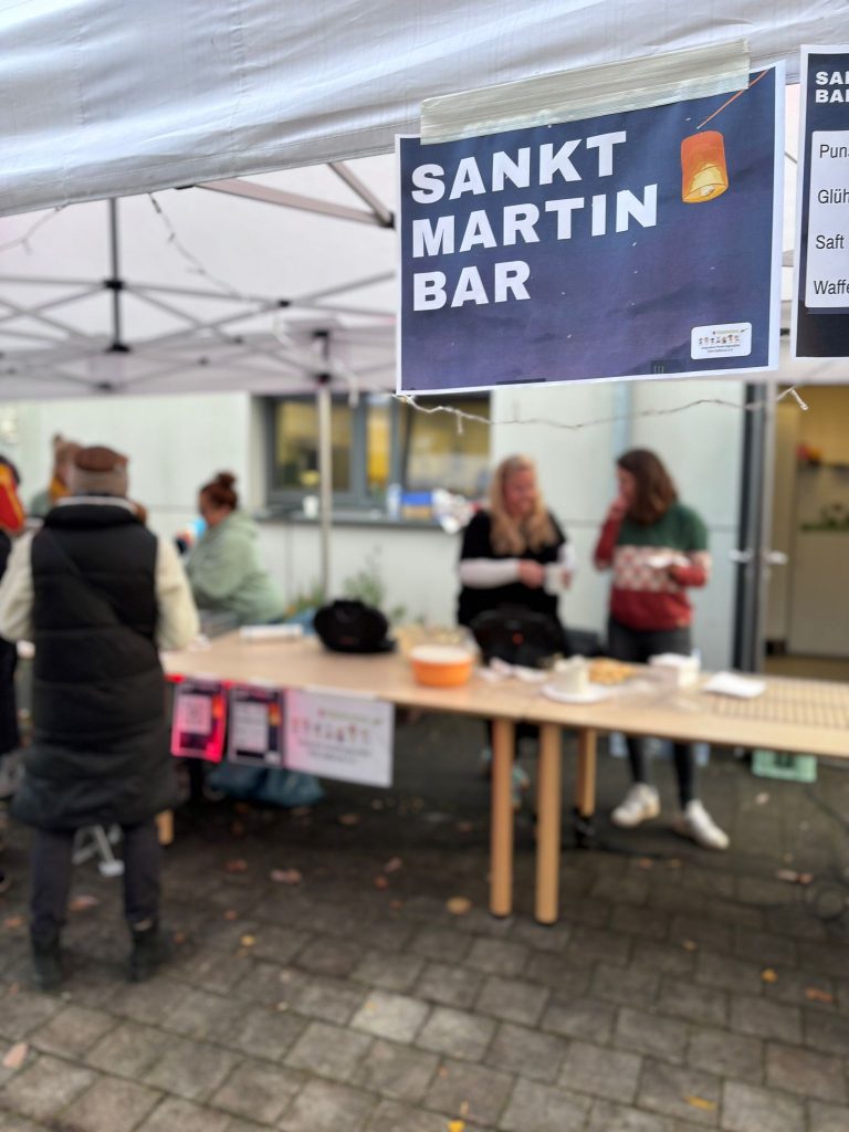 Traditionell hat der Förderverein wieder eine Sankt-Martinsbar ausgerichtet. Geöffnet hatte die Bar dieses Mal schon ab 15.30 Uhr und das Angebot wurde gut genutzt. Es war herrlich gesellig und ein süßer Waffelduft lag erstmalig in der Luft. Die Waffeln (anstelle der Brötchen mit Würstchen) kamen zu der Uhrzeit sehr gut an bei klein und groß. Ab 16.45 Uhr stellten sich dann alle Eltern am großen Feuer auf, nahmen ihre Kinder in Empfang und es wurden noch gemeinsam Martinslieder gesungen.